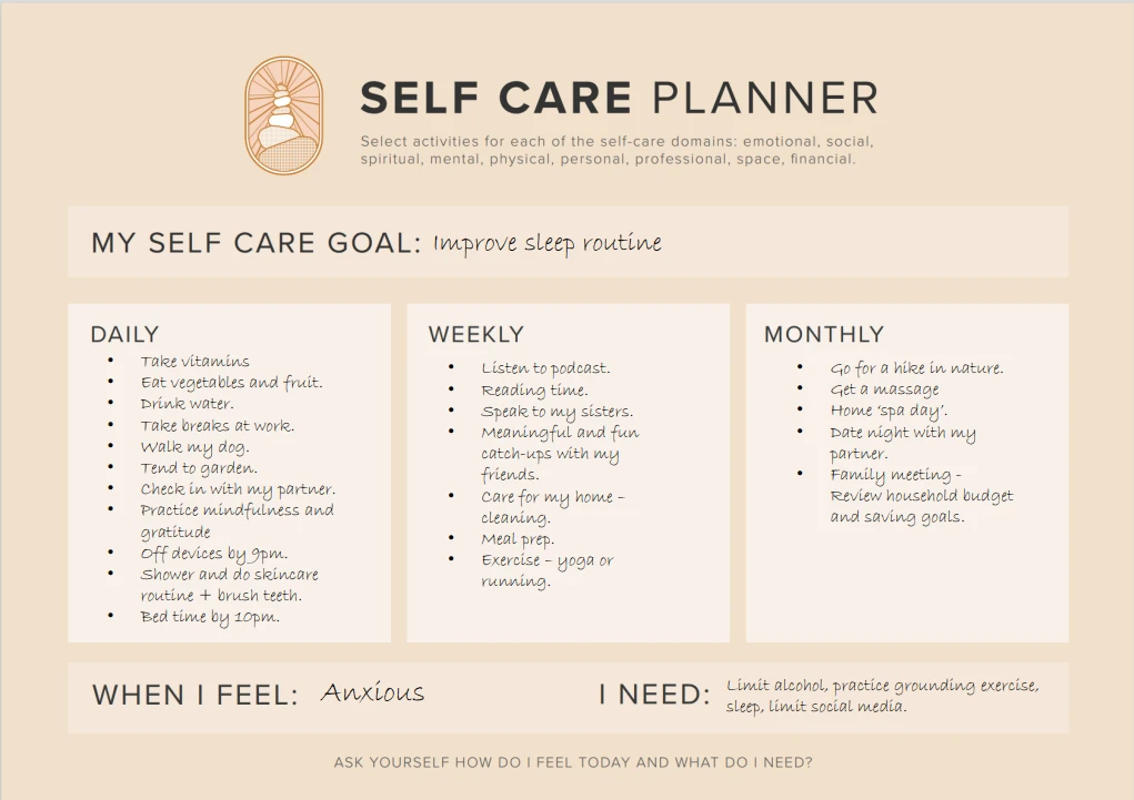 We have created our own self-care planner which incorporates prompts to get you thinking about what you need daily, weekly and monthly to stay well.